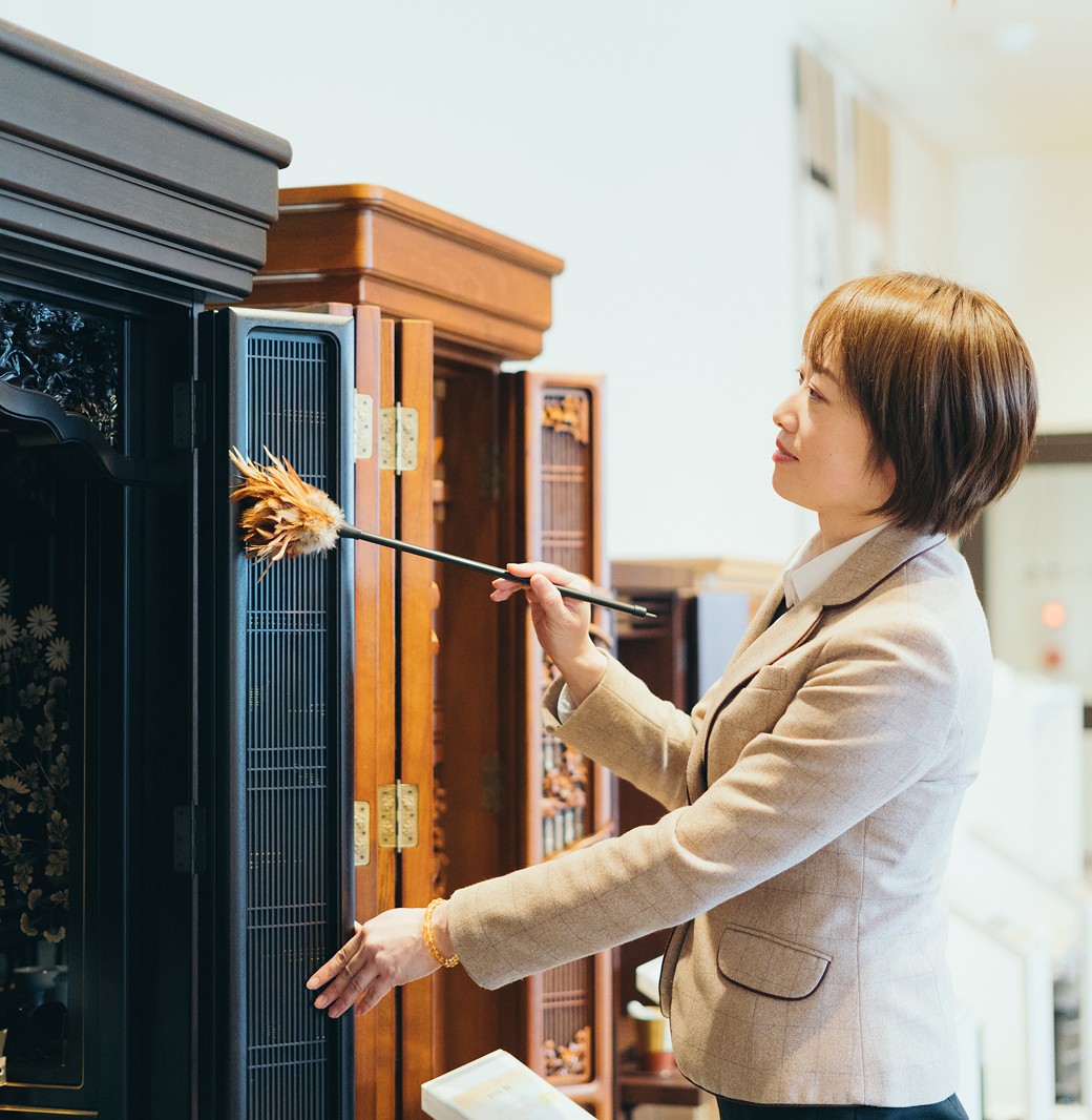 現在は正社員として、ご遺族のサポートや、仏壇・位牌・法要などの相談対応を行っています。例えば、そのお家の御宗派であったり、地域の風習など、「何がわかっていないのかわからない」という状態を少しでもなくせるよう、1つ1つ丁寧にご説明させていただいています。葬儀が終わった後も、ご遺族が安心して次のステップに進めるよう、しっかりお話を聞きながらサポートすることを心がけています。